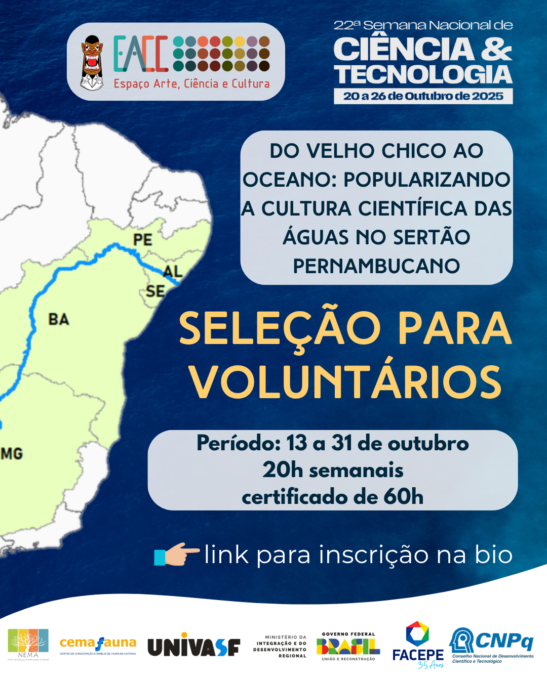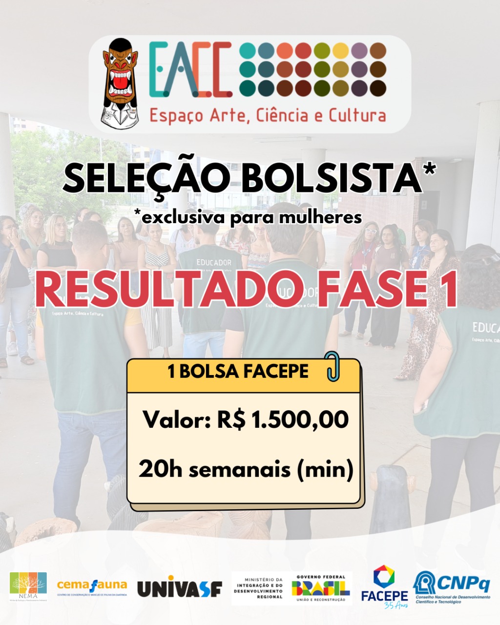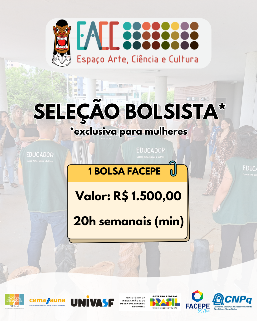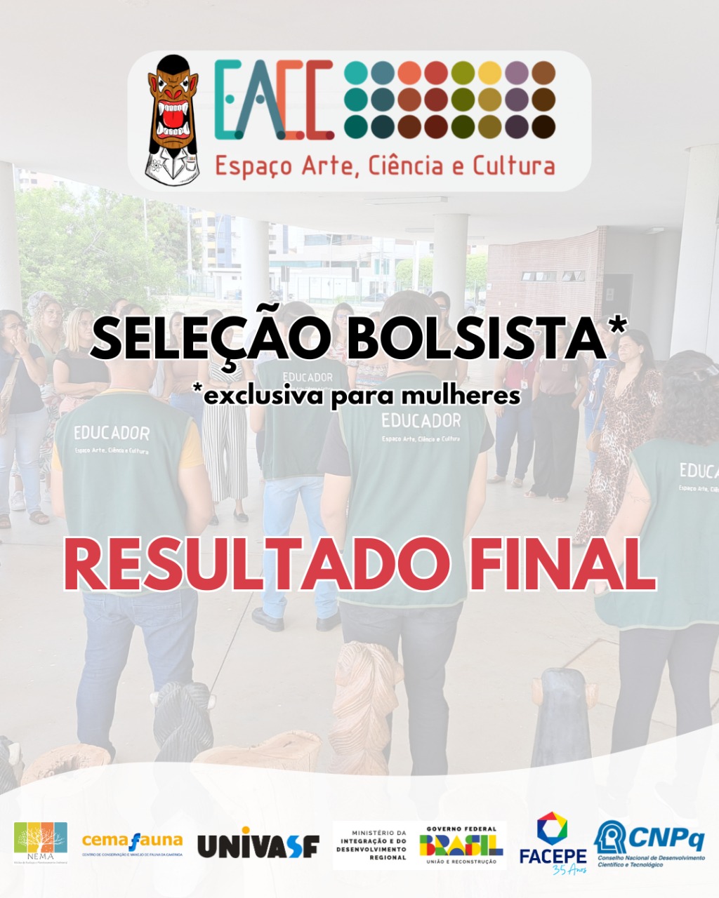 O EACC torna público o resultado final do processo seletivo da Bolsa de Cooperação Técnica (BCT 8 – FACEPE), referente ao Edital nº 01/2025 do EACC, para o projeto “Expansão das ações do EACC para escolas rurais de Petrolina e cidades do Sertão do São Francisco”. ACESSE AQUI O RESULTADO FINAL